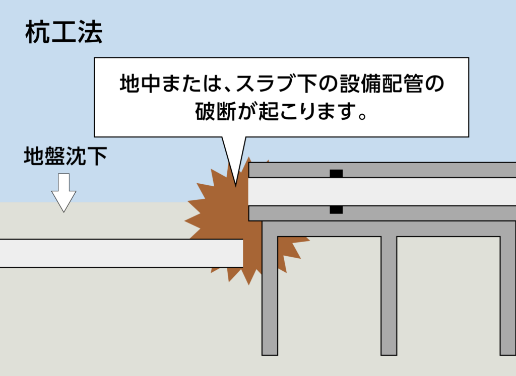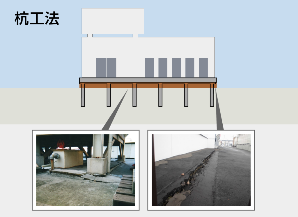 地震発生時のボイリングに対して改良層が保護層となります。過去の東日本大震災、熊本地震等においても同等の杭建物と比べ被害が軽微である事を確認しております。 - 不等沈下に強く不陸の修正が可能