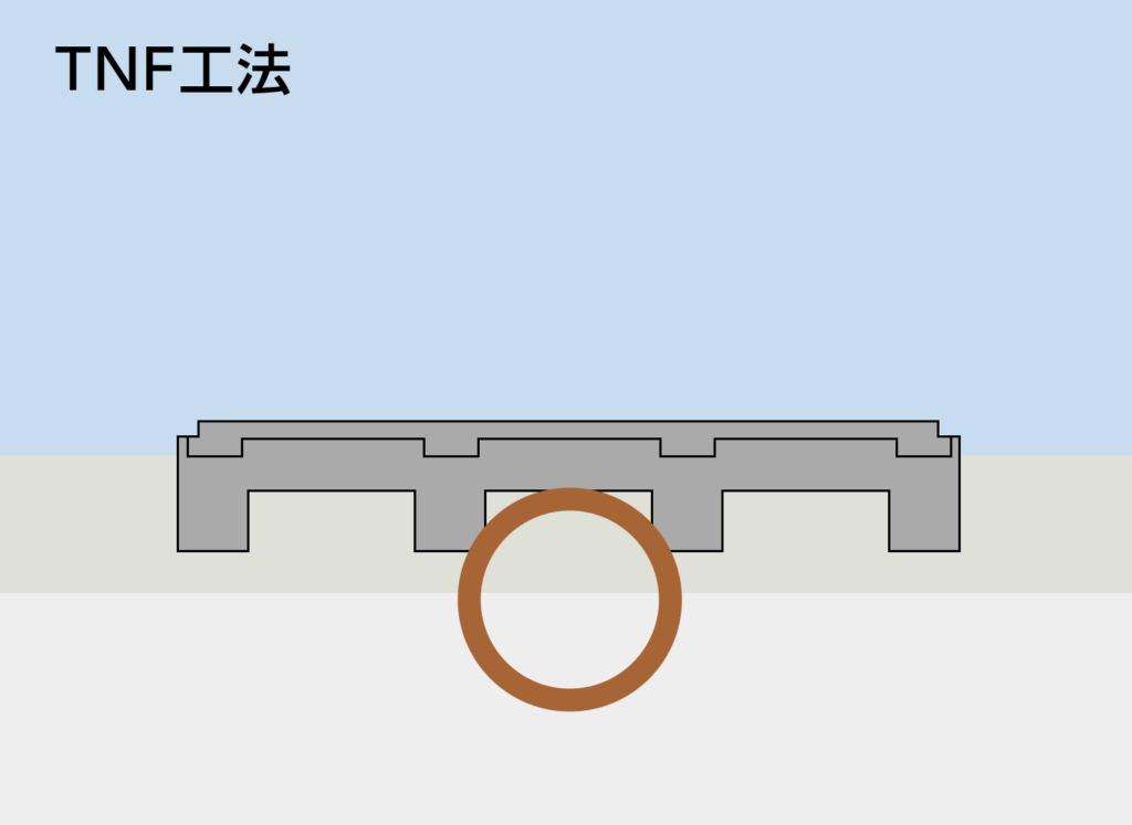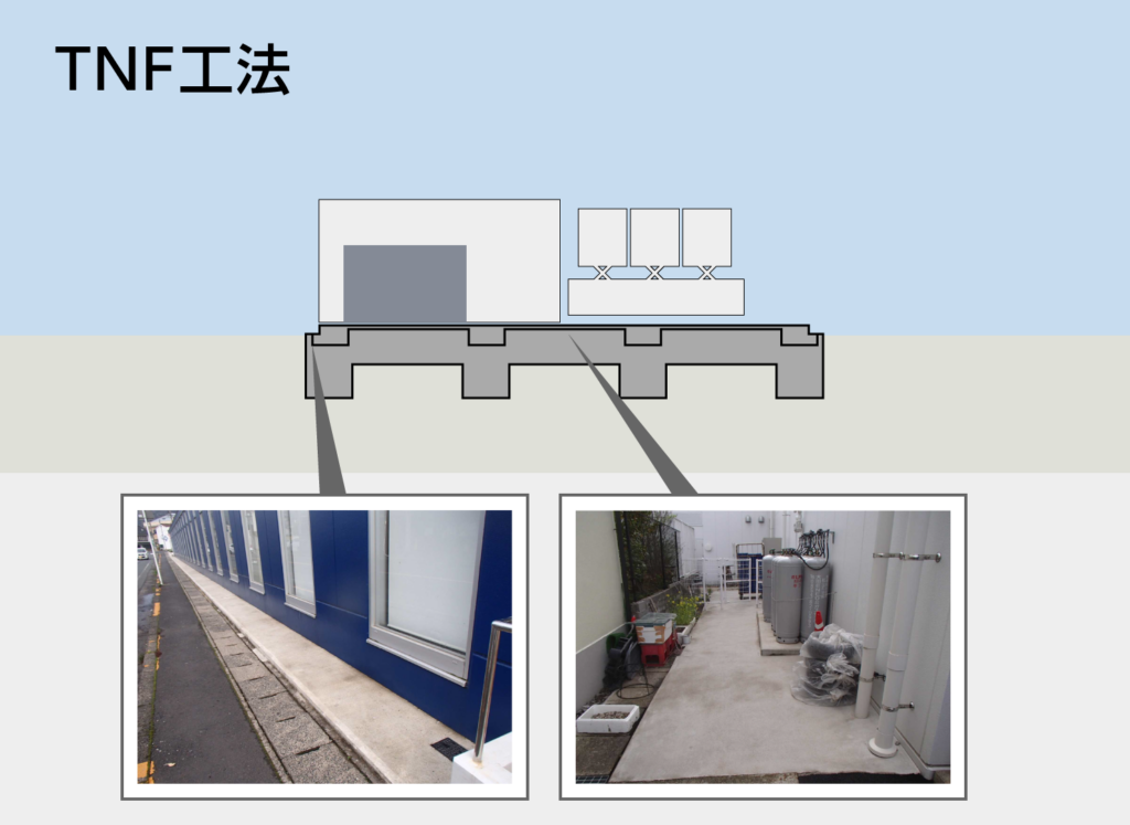 基礎補強、土間補強、基礎型枠工事がTNF工法で一貫施工できます。昨今、型枠職人の確保が困難な状況ですが、基本的に基礎型枠工事が発生しません。 - 汎用重機で施工が可能