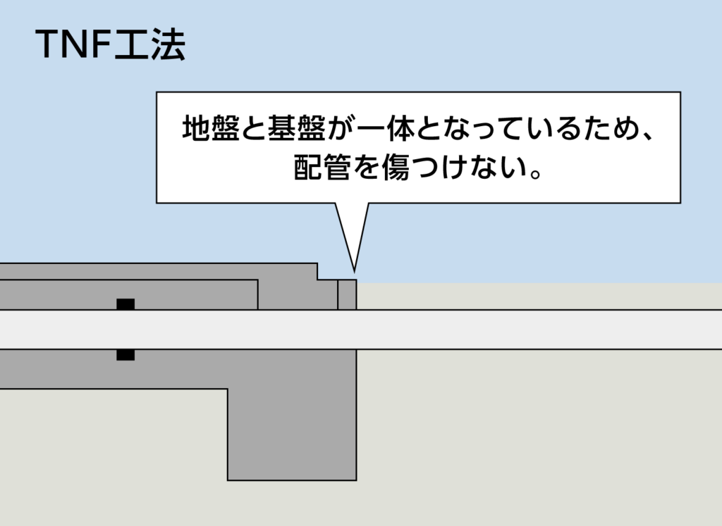 従来工法に比べて、底面を格子状に形成したTNF工法は、荷重が偏って載荷されても、応力が分散するため圧密沈下量が緩和され、不等沈下を起こしにくくなります。また、万が一の不陸発生時でもTNF工法の場合、固い地盤改良体が充てん剤の反力に耐えるので、土間コンクリートと地盤改良体の間にウレタン樹脂を注入し土間を持ち上げることにより、不陸修正が可能です。