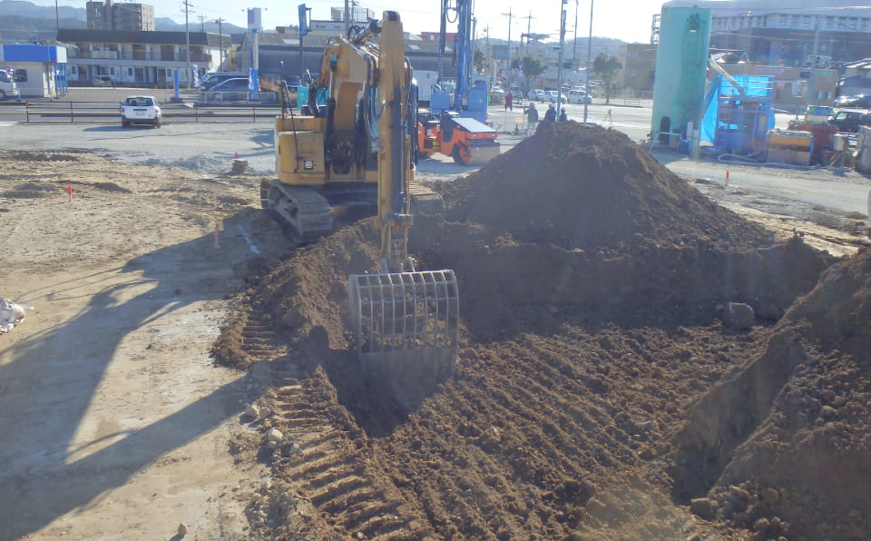 自治体により汚染物質の処理方法は異なりますが、土を出さない方法や汚染土を広げない方法等、柔軟な対応が可能です。想定外のガラが出現しても、TNF工法は表層の改良のみを行うため、改良部分に出たガラを取り除くだけで対応できます。杭工法のようにケーシングでガラや転石を打ち抜く作業が不要なため、追加のコストや工期の延長を最小限に抑えられます。