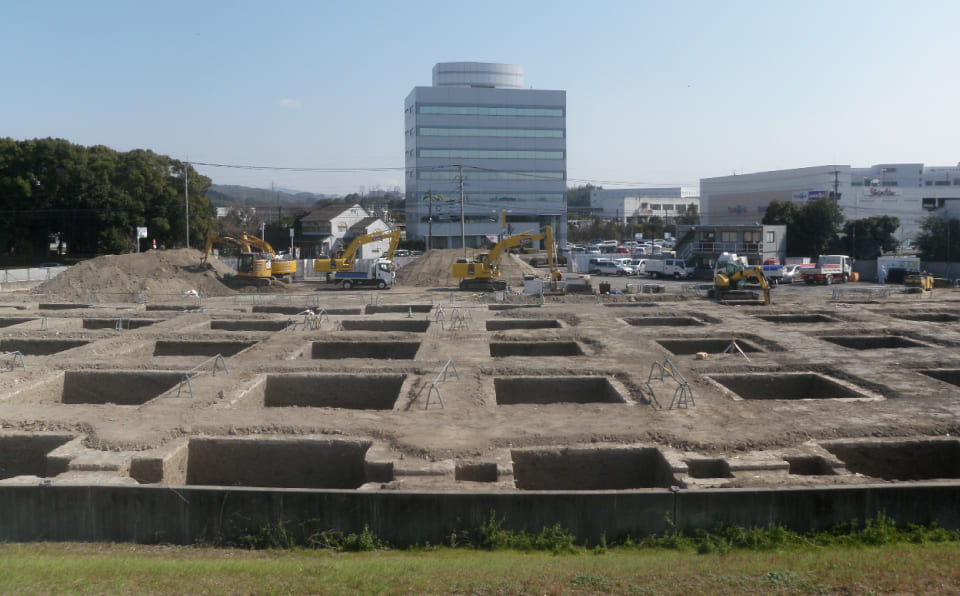 埋立地では、一般的に支持地盤が深い位置にあることが多く、造成地では、地盤状況が一定に保たれていないことや、不要な石やガラが混入していることが問題となり、杭工法を用いた設計・施工が難しくなります。浅層改良工法であるTNF工法は、このような問題を抱える地域での施工が可能であり、神戸のポートアイランド(埋立地)での施工など、多数の実績があります。