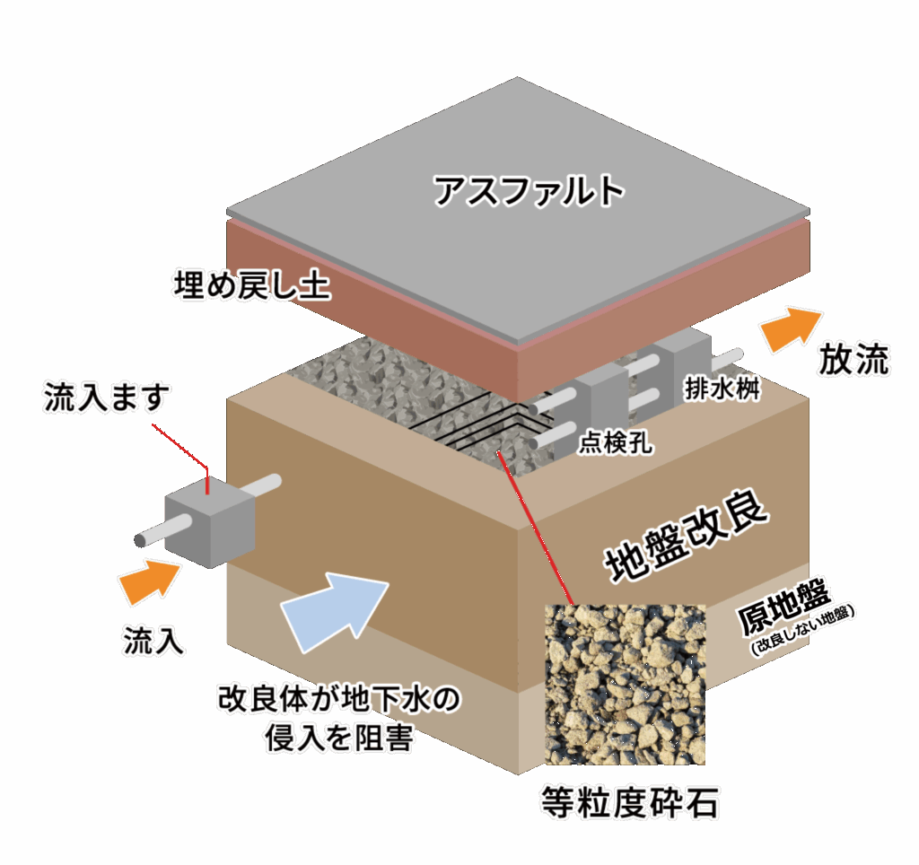 地盤改良層が地下水の侵入を防止し、貯留槽の浮上・変形を抑制するため、地下水位の高い場所でも安定した施工が可能です。高水位地盤や軟弱地盤にも対応できるため、従来のプラスチック貯留槽では困難だった条件下でも施工が容易です。
