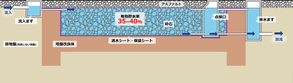 WT工法は、地盤改良体で形成した貯留槽内に等粒度砕石を敷き込み、砕石の間隙に雨水を一時的に貯留します。流入した雨水は貯留空間を通過し、設置された排水桝から制御放流されます。