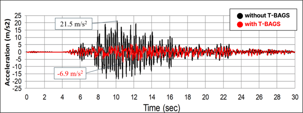 The red line represents the case with T-BAGS, while the black line represents the case without T-BAGS. A comparison of the building’s maximum response acceleration confirms that the peak response is reduced to approximately one-third when T-BAGS is applied.