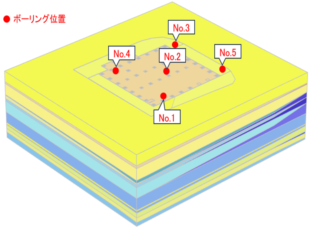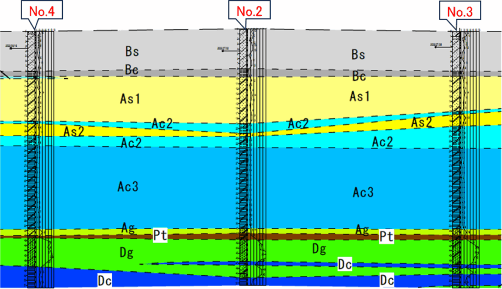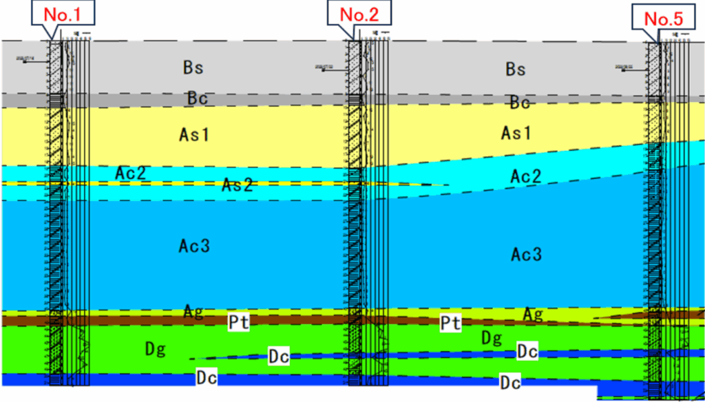 A 3D model is created by estimating soil layers based on borehole investigation data obtained at several locations. By conducting ground analysis with a 3D model, it becomes possible to simulate stress distribution and deformation more accurately, even in complex ground conditions.
