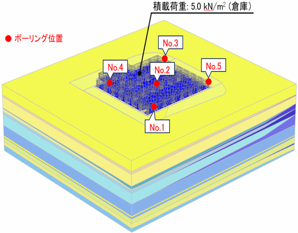 At our company, we perform FEM analysis using 3D models to precisely evaluate settlement caused by consolidation.
