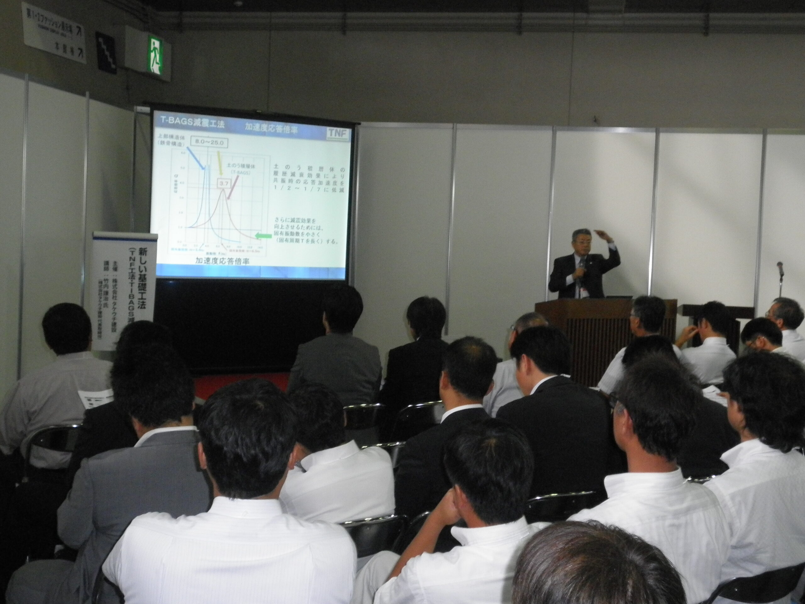 また、10月3日(木)には会場で『TNF工法・T-BAGS減震工法』のセミナーを開催致しました。                                    座席数50名を予定しておりましたが、立ち見が出るほどの大盛況でした。                               多くの方に御参加頂き、誠にありがとうございました。