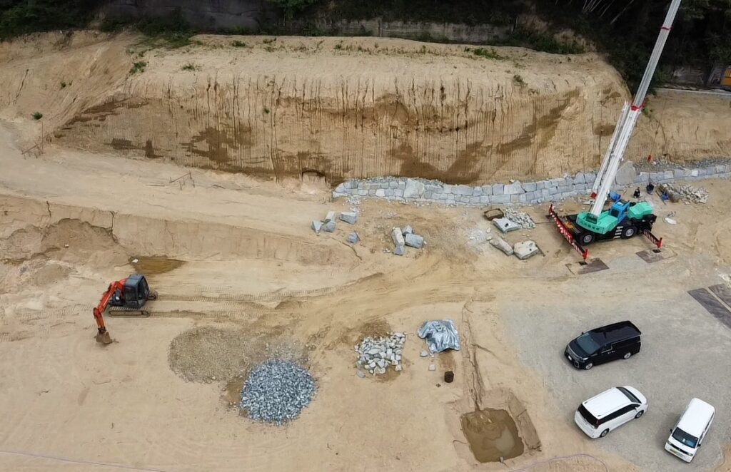 普段滅多に見ることができない石積み施工の様子はとても面白く、現場で大きさ、形の異なる石を削り、位置や角度の微調整を何度も繰り返しながら積みあげる粟田建設さんの技術力に驚いています。