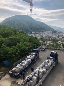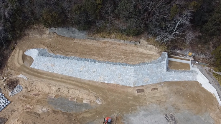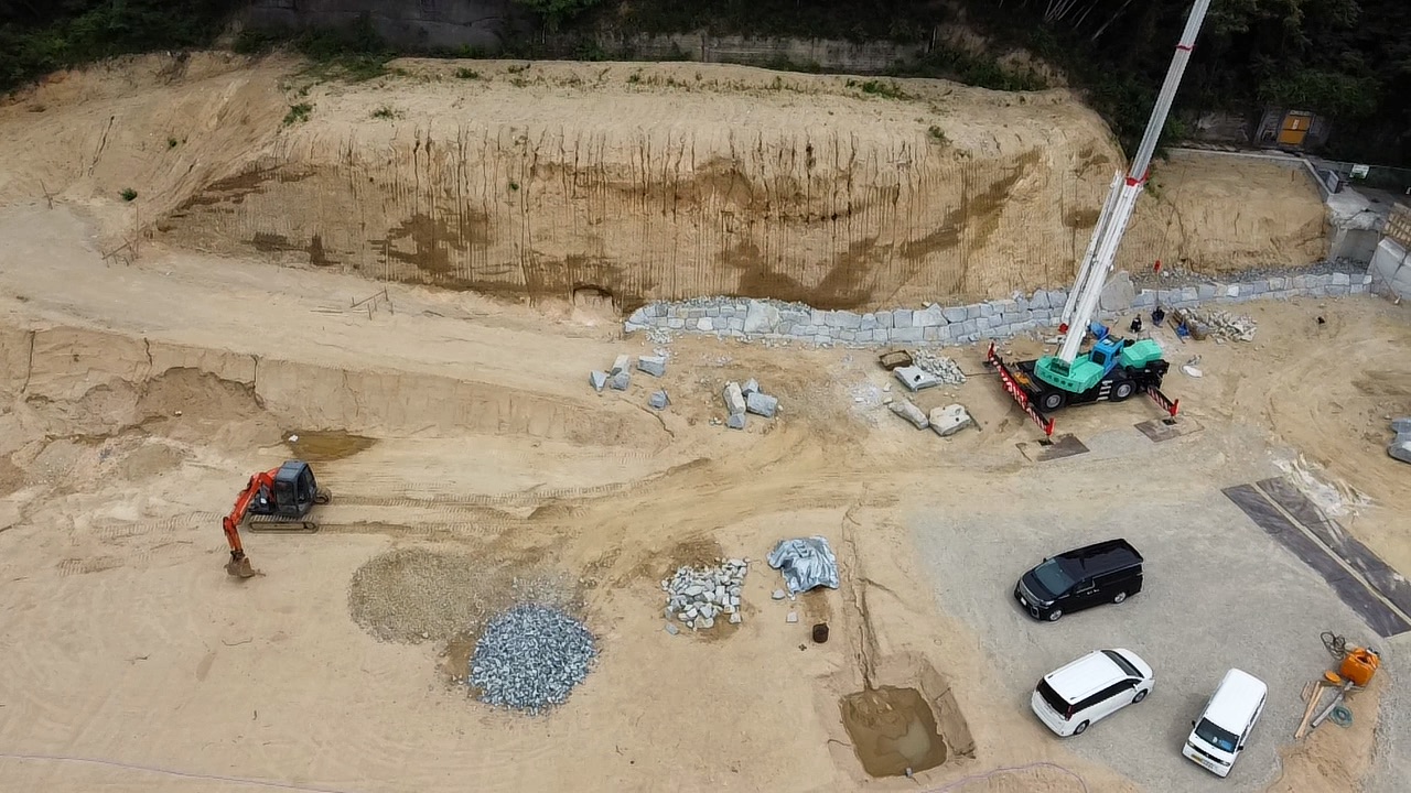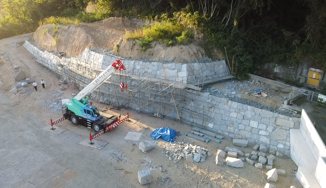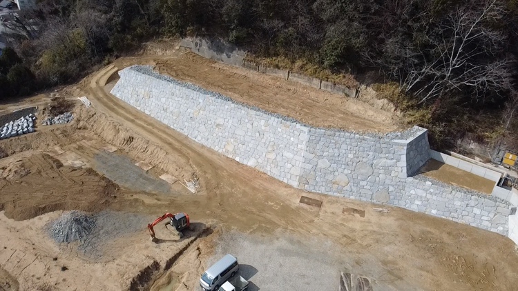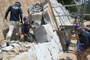 普段滅多に見ることができない石積み施工の様子はとても面白く、現場で大きさ、形の異なる石を削り、位置や角度の微調整を何度も繰り返しながら積みあげる粟田建設さんの技術力に驚いています。