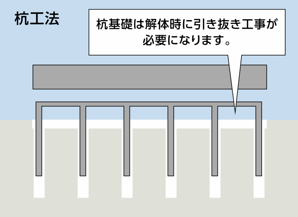 従来の柱状改良や杭工法では、建物撤去時に杭の引き抜き作業など大掛かりな工事が必要で、撤去費用が施工費の3倍程度に達することもあります。