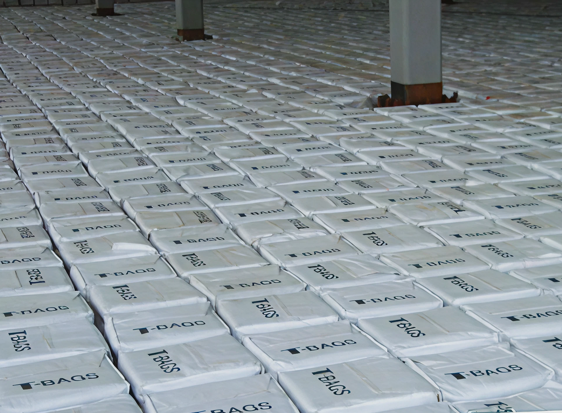 T-BAGSは、ポリプロピレン製の袋に定粒度の砂を入れたものです。これを2段に積み重ね、ベタ基礎などの下に全面に敷き詰めます。